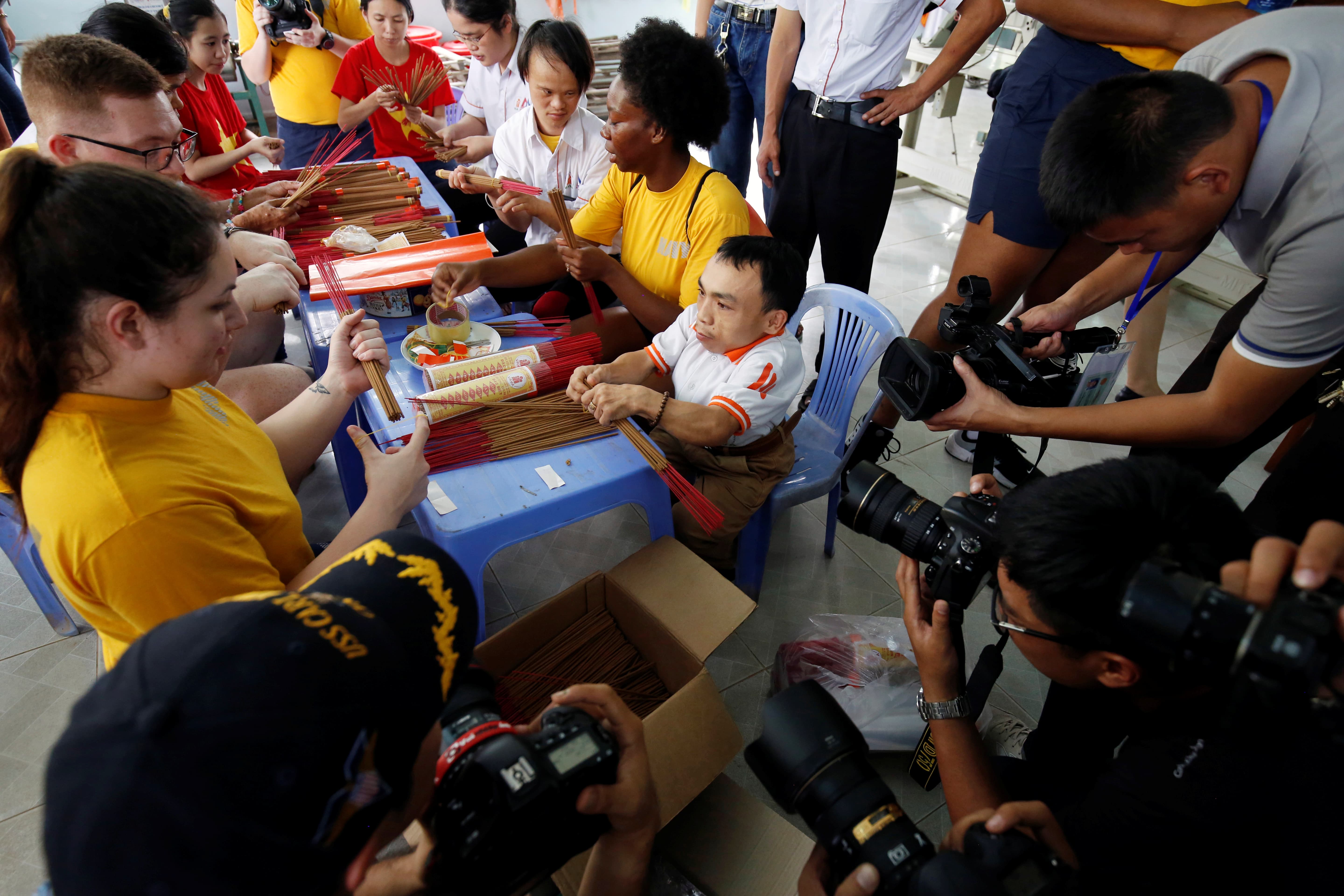 Vietnamese Agent Orange victim Nguyen Ngoc Phuong (C), 36, guides US sailors as they pack incense sticks at a hospice, as part of the US aircraft carrier USS Carl Vinson visit in Danang, Vietnam March 7, 2018. (Photo: Reuters)