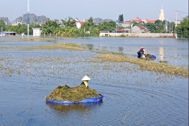 Farmers harvest rice on a flooded field after a heavy rainfall caused by a tropical depression in Ninh Binh province, Vietnam October 14, 2017. (Photo: Reuters)