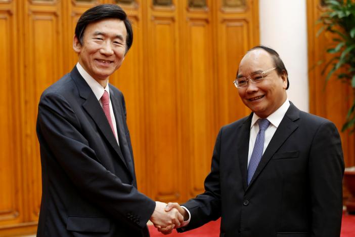 South Korean Foreign Minister Yun Byung-Se (L) is welcomed by Vietnam’s Deputy Prime Minister Pham Binh Minh. (Photo: Reuters)