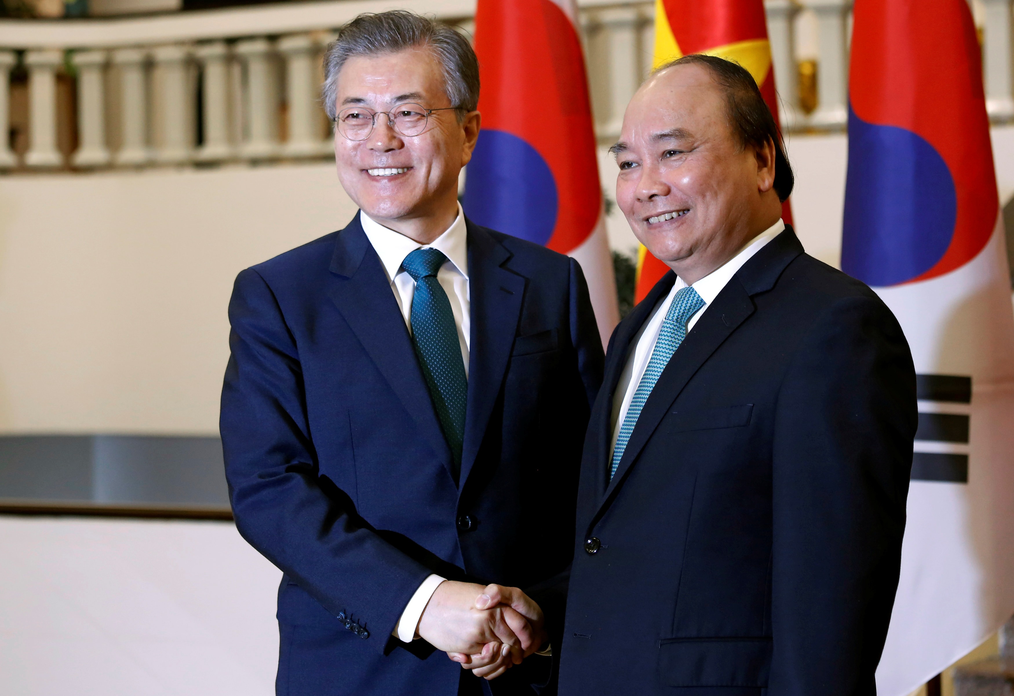 South Korea’s President Moon Jae-in (L) poses for a photo with Vietnam’s Prime Minister Nguyen Xuan Phuc at the Government Office in Hanoi, Vietnam March 23, 2018. (Photo: Reuters/Kham/Pool)