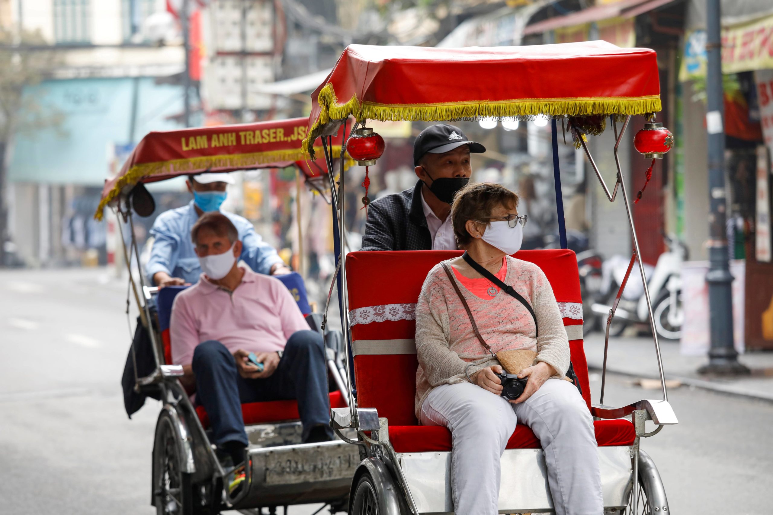 Foreign tourists wear protective masks while traveling on three-wheel cycle along old quarters streets in Hanoi, Vietnam March 17, 2020. (Photo: Reuters)