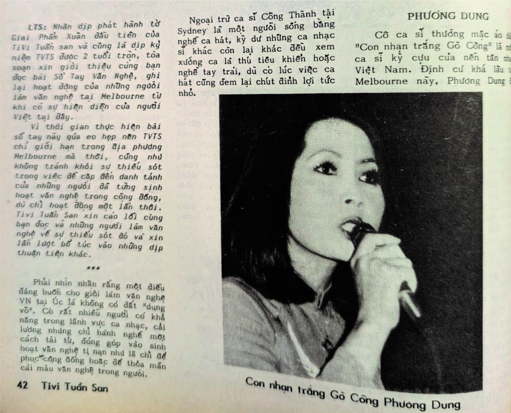 Bài báo trong Giai phẩm Xuân Mậu Thìn 1988 với chữ bằng typewriter bỏ dấu bằng tay với hình ca sĩ Phương Dung LTS: Cộng đồng Việt Nam tại Victoria đang chuẩn bị tưởng niệm 50 năm Tháng Tư Đen, 50 năm định cư và tự do… Biết bao nhiêu thay đổi sau 50 năm đổi đời ấy. Sinh hoạt văn nghệ của người Việt tại Melbourne hiện nay như thế nào, có lẽ mọi người đều biết? Nhưng 50 năm trước, hay nói rõ hơn sinh hoạt văn nghệ của 37 năm trước ra sao? Ai còn, ai mất, ai đã giã từ sân khấu? Và ai còn trụ đến hôm nay, dù chỉ là làm văn nghệ tài tử?
