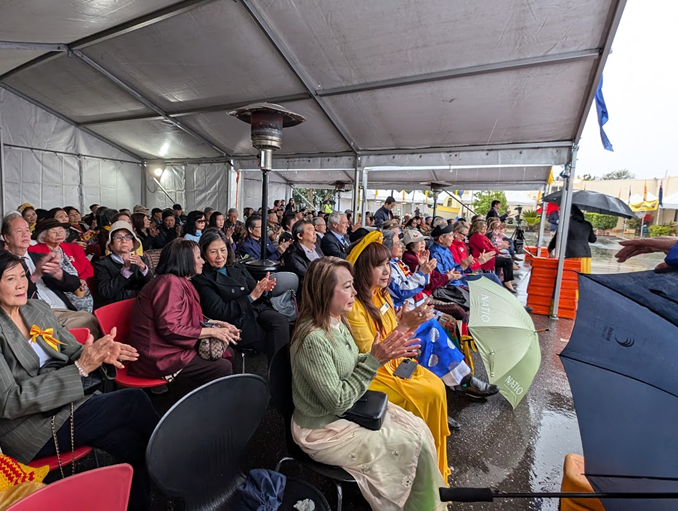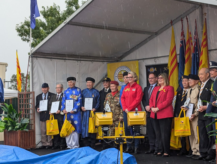 Trời mưa và gió lớn ở miền tây Melbourne hôm Chủ Nhật 26/10/2025 vẫn không ngăn cản các chính trị gia Úc và gốc Việt cùng đồng hương đến dự lễ phát bằng tưởng lục của Quốc hội và plaque lưu niệm của Cộng Đồng cho các cựu quân nhân QLVNCH và các quả phụ của các cựu quân nhân. Hình: TVTS