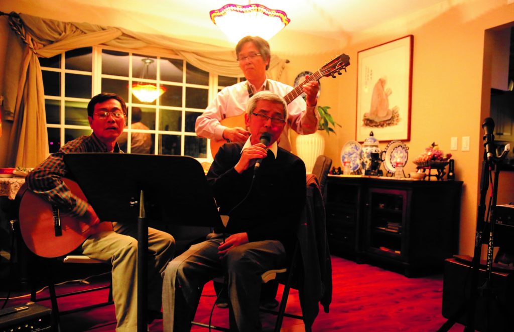 Chưa nghe vì tác giả có nhiều ca khúc?! Các ca sĩ thân hữu ngạc nhiên khi tác giả hát “bi ca” Nghe Về Nỗi Nhớ trong CD-2 với sự đệm đàn của nhạc sĩ tây ban cầm Cao Vinh Quang (trái) và nhạc sĩ Đinh Trung Chính