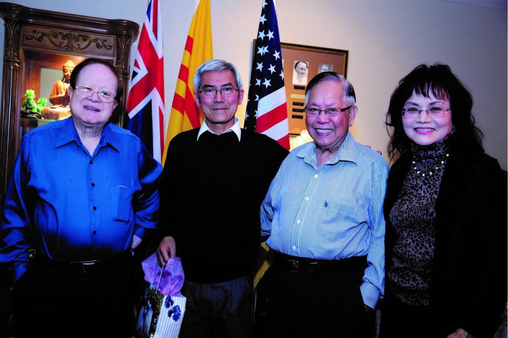 Tác giả Nguyễn Hồng-Anh (thứ hai từ trái) và túi quà kỷ niệm của vợ chồng Nhạc trưởng Lê Văn Khoa (bìa trái và phải) tặng khi chia tay, bên cạnh là Giáo sư Nguyễn Xuân Vinh
