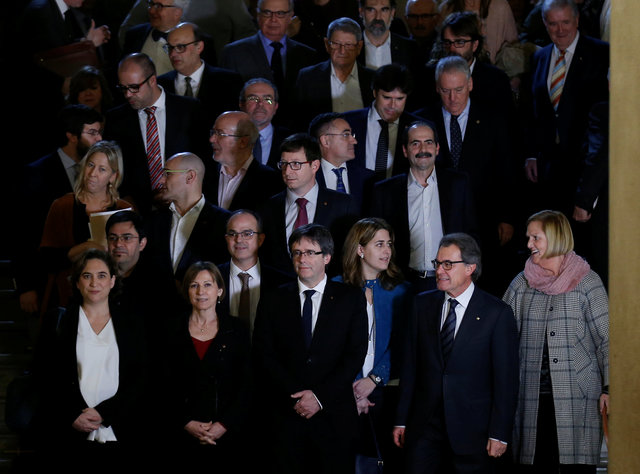 (L-R) Barcelona’s mayor Ada Colau, Catalonia’s speaker of Parliament Carme Forcadell, Catalonia’s regional President Carles Puigdemont and former Catalonia’s regional President Artur Mas. (Photo: Reuters)