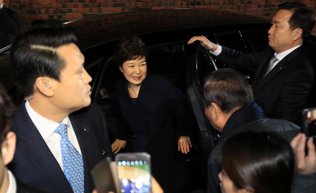 Sau khi chào tạm biệt các nhân viên Nhà Xanh, bà Park lên một trong những chiếc xe màu đen đang đợi sẵn, theo sau là đoàn xe cảnh sát hộ tống.