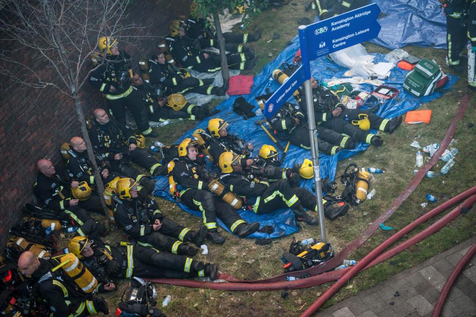 Nhân viên cứu hỏa mệt nhoài sau vụ hỏa hoạn tòa nhà cao tầng ở London. Photo Courtesy: London News Pictures